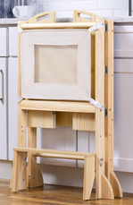 I think this is the most "bang for your buck" tower I've seen! Not only is it foldable for storage and comes with full enclosure and safety mesh, it also can double as a slide and a chalk board! This looks like a fantastic option for anyeone looking for a multi-purpose tower. The two downsides I will note on this tower are the fact that it doesn't have an adjustable height standing platform and there are cut-outs on the side which pose a potential issue for some toddlers climbing up onto the counter. On a positive note, I do like that they include the full enclosure & added safety mesh to prevent falling from the tower. Overall, this one looks like a lot of fun!